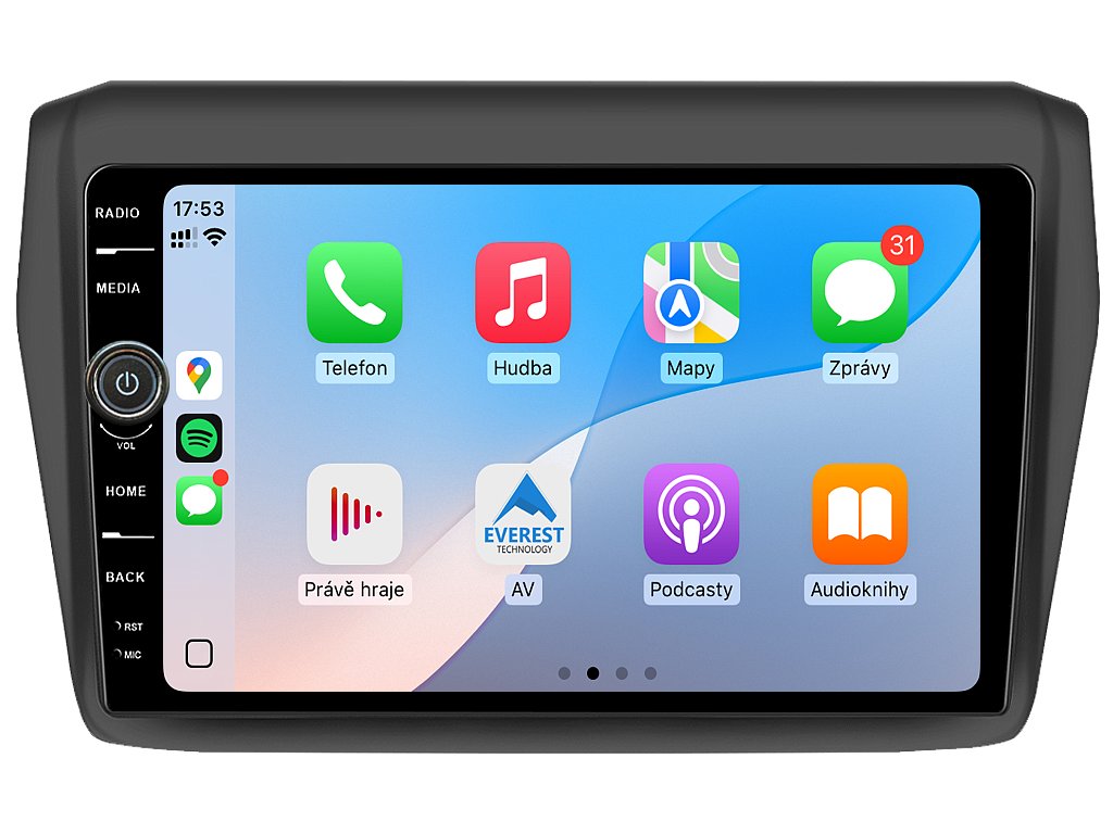 2DIN autorádio Everest EVE66 pre Suzuki Swift III (Gen 5) stanovuje nové štandardy vo svete multimediálnych technológií. Na prvý pohľad zaujme 9 palcovou QLED obrazovkou s neuveriteľným rozlíšením 1280 x 800. Môžete na nej sledovať videá a prezerať fotografie s podporou aplikácií pre systém Android. Stabilný software s 8-jadrovým procesorom a 6 GB RAM zaručuje špičkový výkon a plynulý chod aplikácií. Náročný poslucháč ocení funkciu DSP (digitálneho signálového procesora), ktorá mnohonásobne zvyšuje kvalitu reprodukcie. Pomocou 4G modulu sa z vášho autorádia stane smartfón, z ktorého môžete posielať SMS správy, používať online GPS navigáciu s aktuálnou dopravnou situáciou alebo využívať ďalšie užitočné funkcie. Váš mobilný telefón zostane už navždy vo vrecku vďaka bezdrôtovej funkcii CarPlay a Android Auto. Vďaka systému Android 14 budete mať v aute kompletné multimediálne centrum plné funkcií a aplikácií. Pohľad z parkovacej kamery vám umožní bezpečne a nerušene cúvať. Autorádio ponúka výber z rôznych jazykov, medzi ktorými je aj preklad základnej časti systému do slovenčiny.