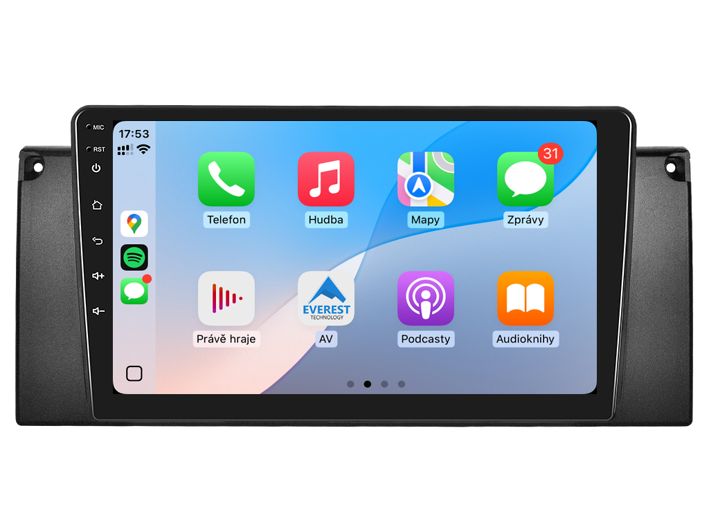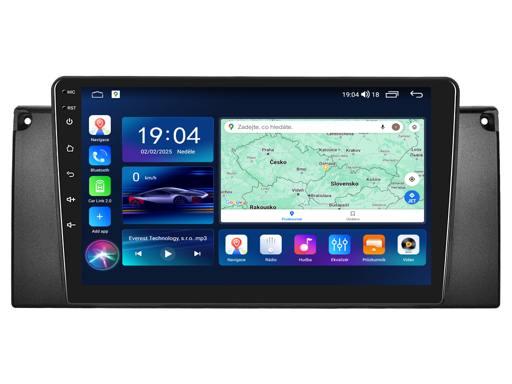 2DIN autorádio Everest EVT21 pre BMW X5 E53 a BMW E39 stanovuje nové štandardy vo svete multimediálnych technológií. Na prvý pohľad zaujme 9 palcovou QLED obrazovkou s neuveriteľným rozlíšením 1280 x 800. Môžete na nej sledovať videá a prezerať fotografie s podporou aplikácií pre systém Android. Stabilný software s 8-jadrovým procesorom a 6 GB RAM zaručuje špičkový výkon a plynulý chod aplikácií. Náročný poslucháč ocení funkciu DSP (digitálneho signálového procesora), ktorá mnohonásobne zvyšuje kvalitu reprodukcie. Pomocou 4G modulu sa z vášho autorádia stane smartfón, z ktorého môžete posielať SMS správy, používať online GPS navigáciu s aktuálnou dopravnou situáciou alebo využívať ďalšie užitočné funkcie. Váš mobilný telefón zostane už navždy vo vrecku vďaka bezdrôtovej funkcii CarPlay a Android Auto. Vďaka systému Android 15 budete mať v aute kompletné multimediálne centrum plné funkcií a aplikácií. Pohľad z parkovacej kamery vám umožní bezpečne a nerušene cúvať. Autorádio ponúka výber z rôznych jazykov, medzi ktorými je aj preklad základnej časti systému do slovenčiny.