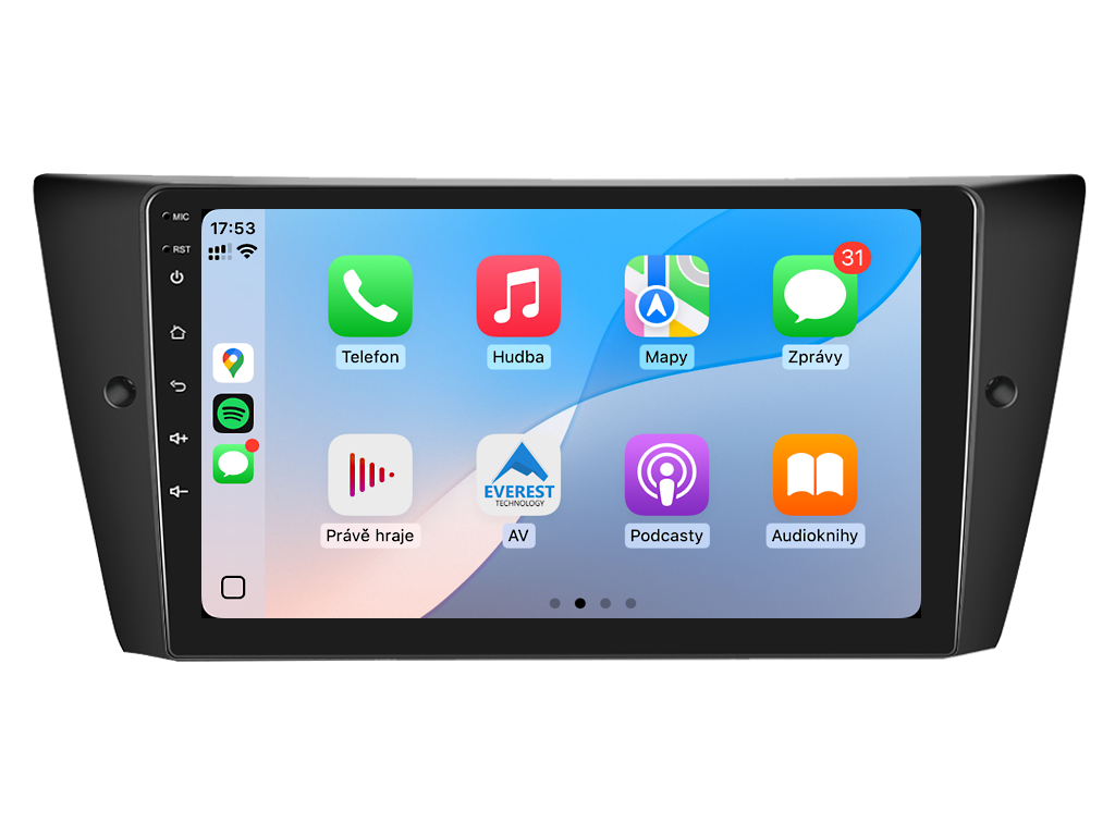 2DIN autorádio Everest EVT22 pre BMW E90 / E91 / E92 / E93 stanovuje nové štandardy vo svete multimediálnych technológií. Na prvý pohľad zaujme 9 palcovou QLED obrazovkou s neuveriteľným rozlíšením 1280 x 800. Môžete na nej sledovať videá a prezerať fotografie s podporou aplikácií pre systém Android. Stabilný software s 8-jadrovým procesorom a 6 GB RAM zaručuje špičkový výkon a plynulý chod aplikácií. Náročný poslucháč ocení funkciu DSP (digitálneho signálového procesora), ktorá mnohonásobne zvyšuje kvalitu reprodukcie. Pomocou 4G modulu sa z vášho autorádia stane smartfón, z ktorého môžete posielať SMS správy, používať online GPS navigáciu s aktuálnou dopravnou situáciou alebo využívať ďalšie užitočné funkcie. Váš mobilný telefón zostane už navždy vo vrecku vďaka bezdrôtovej funkcii CarPlay a Android Auto. Vďaka systému Android 15 budete mať v aute kompletné multimediálne centrum plné funkcií a aplikácií. Pohľad z parkovacej kamery vám umožní bezpečne a nerušene cúvať. Autorádio ponúka výber z rôznych jazykov, medzi ktorými je aj preklad základnej časti systému do slovenčiny.