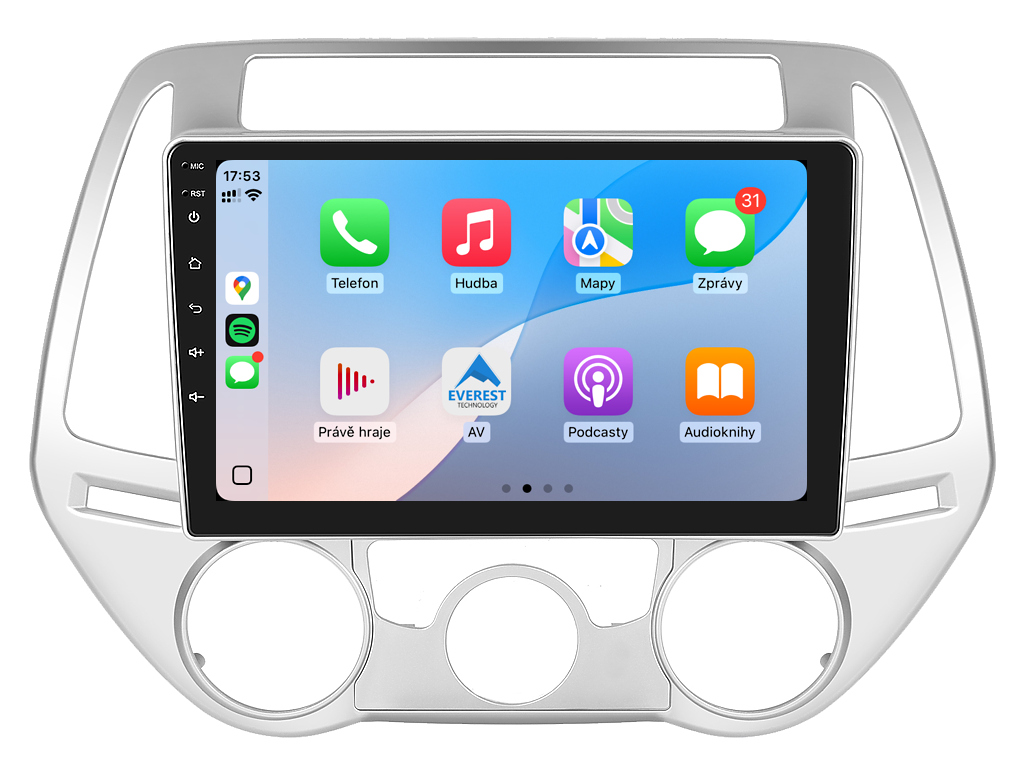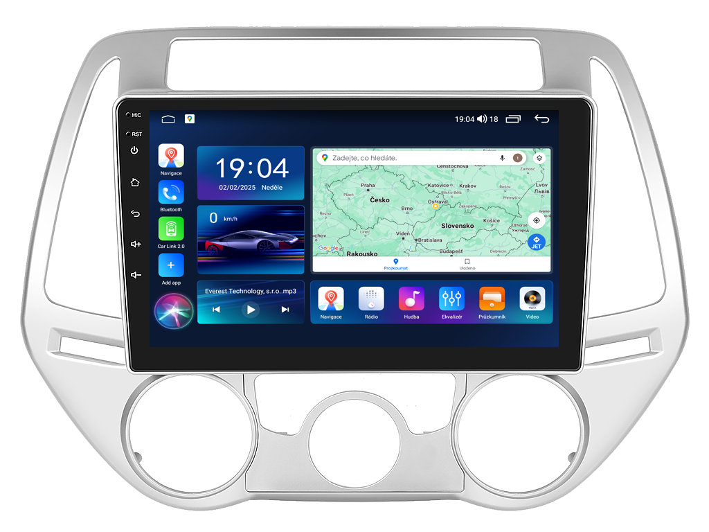 2DIN autorádio Everest EVT30 pre Hyundai i20 stanovuje nové štandardy vo svete multimediálnych technológií. Na prvý pohľad zaujme 9 palcovou QLED obrazovkou s neuveriteľným rozlíšením 1280 x 800. Môžete na nej sledovať videá a prezerať fotografie s podporou aplikácií pre systém Android. Stabilný software s 8-jadrovým procesorom a 6 GB RAM zaručuje špičkový výkon a plynulý chod aplikácií. Náročný poslucháč ocení funkciu DSP (digitálneho signálového procesora), ktorá mnohonásobne zvyšuje kvalitu reprodukcie. Pomocou 4G modulu sa z vášho autorádia stane smartfón, z ktorého môžete posielať SMS správy, používať online GPS navigáciu s aktuálnou dopravnou situáciou alebo využívať ďalšie užitočné funkcie. Váš mobilný telefón zostane už navždy vo vrecku vďaka bezdrôtovej funkcii CarPlay a Android Auto. Vďaka systému Android 15 budete mať v aute kompletné multimediálne centrum plné funkcií a aplikácií. Pohľad z parkovacej kamery vám umožní bezpečne a nerušene cúvať. Autorádio ponúka výber z rôznych jazykov, medzi ktorými je aj preklad základnej časti systému do slovenčiny.