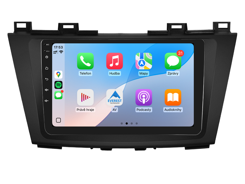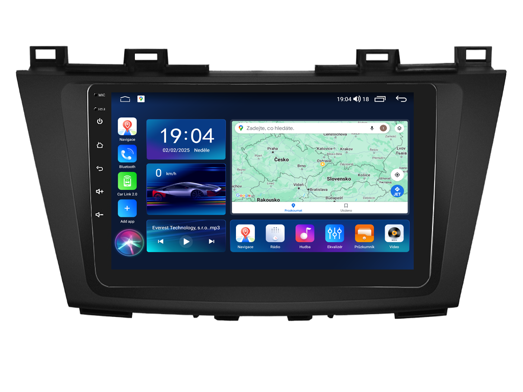 2DIN autorádio Everest EVT41 pre Mazda 5 stanovuje nové štandardy vo svete multimediálnych technológií. Na prvý pohľad zaujme 9 palcovou QLED obrazovkou s neuveriteľným rozlíšením 1280 x 800. Môžete na nej sledovať videá a prezerať fotografie s podporou aplikácií pre systém Android. Stabilný software s 8-jadrovým procesorom a 6 GB RAM zaručuje špičkový výkon a plynulý chod aplikácií. Náročný poslucháč ocení funkciu DSP (digitálneho signálového procesora), ktorá mnohonásobne zvyšuje kvalitu reprodukcie. Pomocou 4G modulu sa z vášho autorádia stane smartfón, z ktorého môžete posielať SMS správy, používať online GPS navigáciu s aktuálnou dopravnou situáciou alebo využívať ďalšie užitočné funkcie. Váš mobilný telefón zostane už navždy vo vrecku vďaka bezdrôtovej funkcii CarPlay a Android Auto. Vďaka systému Android 15 budete mať v aute kompletné multimediálne centrum plné funkcií a aplikácií. Pohľad z parkovacej kamery vám umožní bezpečne a nerušene cúvať. Autorádio ponúka výber z rôznych jazykov, medzi ktorými je aj preklad základnej časti systému do slovenčiny.