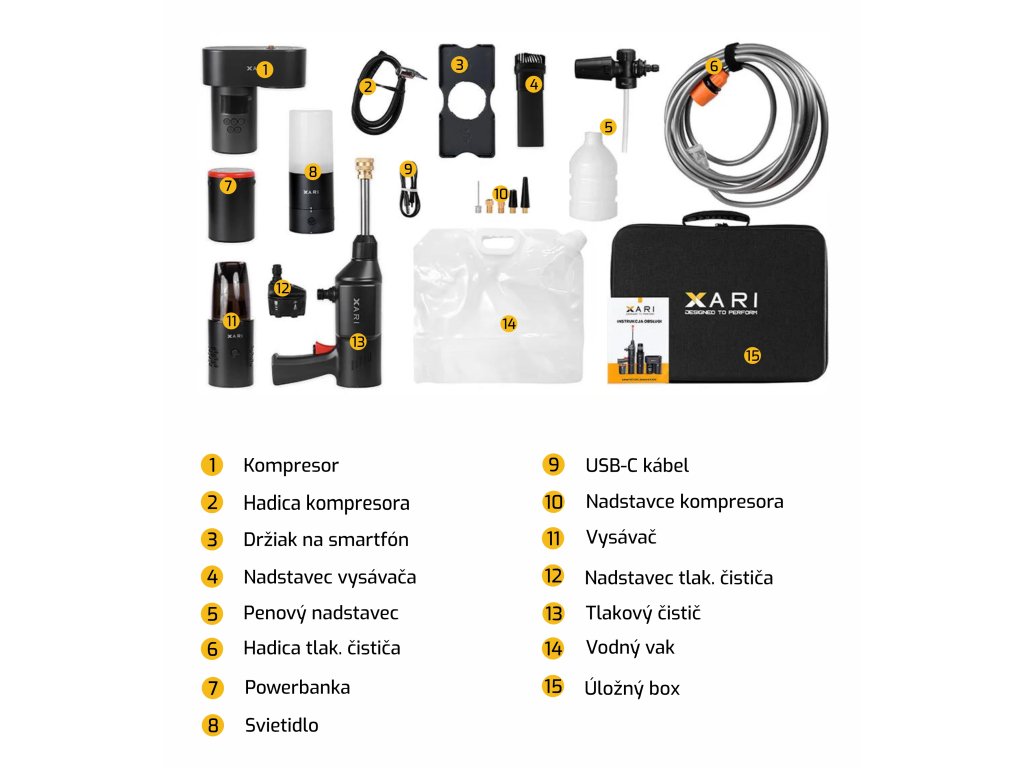 Multifunkčné zariadenie XARI XP2 kombinuje vysokotlakový čistič (vapku), penový nadstavec, vysávač, kompresor a svietidlo, čo vám umožňuje rýchlo a efektívne čistiť exteriér aj interiér vozidla a dohustiť pneumatiky pomocou jedného zariadenia aj za zhoršených svetelných podmienok. Vďaka napájaniu z powerbanky pracuje bez nutnosti pripojenia k elektrickej zásuvke, čo poskytuje úplnú mobilitu na cestách aj pre každodenné použitie.