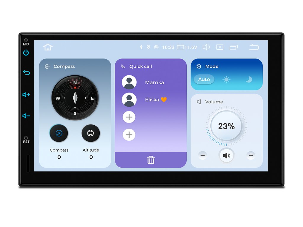 Displej 2DIN autorádia je zameraný na dokonalé ovládanie s maximálnou prehľadnosťou. Obraz rádia je v HD rozlíšení s uhlopriečkou neuveriteľných 7 palcov. Vďaka veľkosti obrazovky má autorádio väčší displej ako väčšina bežne používaných autorádií. Autorádio sa ľahko ovláda jemným dotykom na displeji, ktorý je veľmi citlivý aj pri stlačení ikony v rukaviciach.