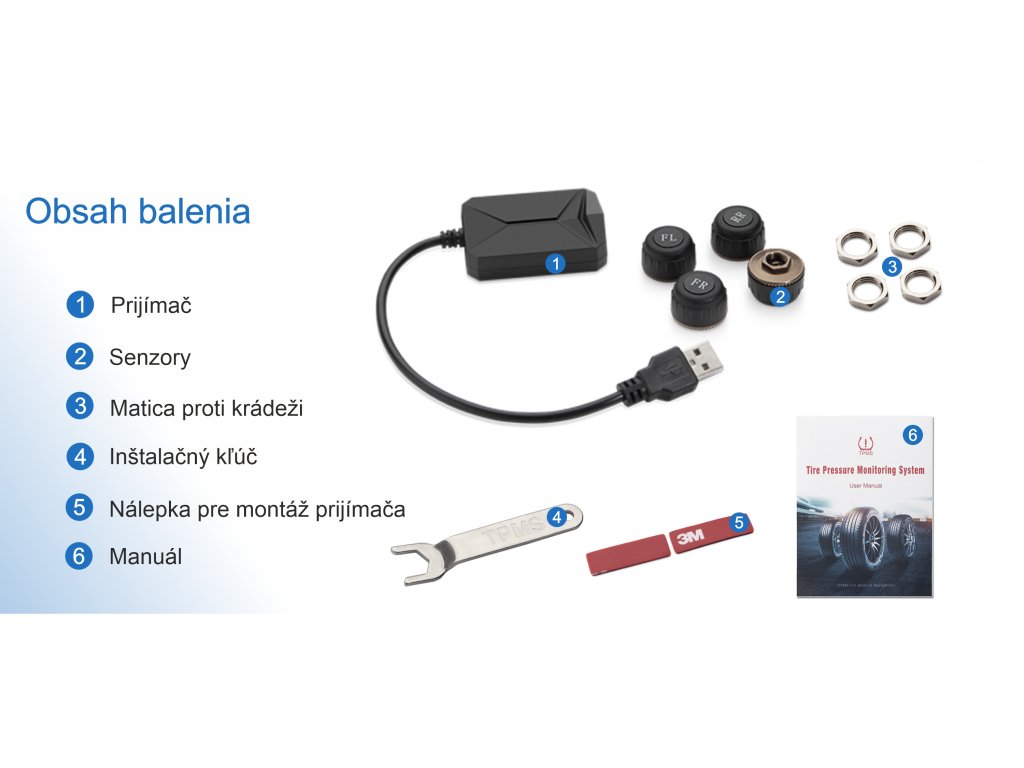 Vďaka jednoduchej inštalácii sa k informáciám o Vašich pneumatikách dostanete naozaj rýchlo a pohodlne. Stačí senzory TPMS spolu s maticami naskrutkovať namiesto vonkajších ventilov pneumatík. Následne pripojíte prijímač pomocou USB k chytrému autorádiu so systémom Android 9 a vyšším a po stiahnutí špeciálnej aplikácie už môžete sledovať aktuálnu teplotu a tlak v pneumatikách.